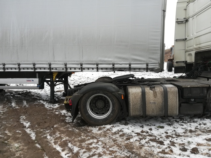 Подхожу ближе, вижу что отцепился. Но, как то странно. ТО-шка начала его тянуть и я не знаю как и почему, но полуприцеп слетел с седла и съехал вниз. Сбрил на тягаче крыло, горловину топливного бака...