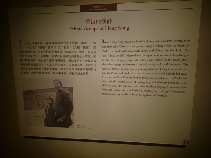 Начинается все с ранней эпохи, дальше рассказывается о четырех этнических группах гонконгцев, история каждой из них с инсталляциями. Национальные костюмы, предметы быта, дома, промысел ну и так далее. Сходить стоит.