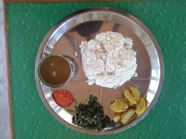Дорога была шикарная, сплошной горный серпантин, гоняющие индийские грузовики и автобусы TATA, ловко лавирующие на этой узкой дороге. В обед была большая остановка у кафешки, где был шведский стол с блюдом Дал Бат. 300 рупий (меньше 3 долларов) за Дал Бат с курицей, и вы накладываете сколько угодно и чего угодно. Красота...