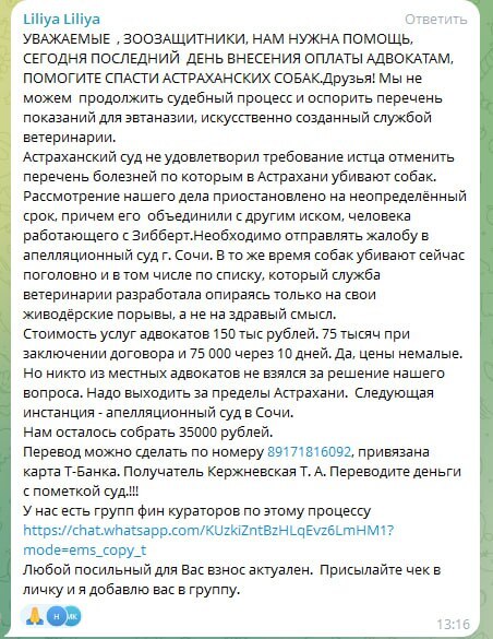 Сегодня, 18 ноября 2025 года, в Третьем апелляционном суде общей юрисдикции г. Сочи состоялось заседание по делу астраханской зоозащитницы Т. Кержневской, которое закончилось безрезультатно.