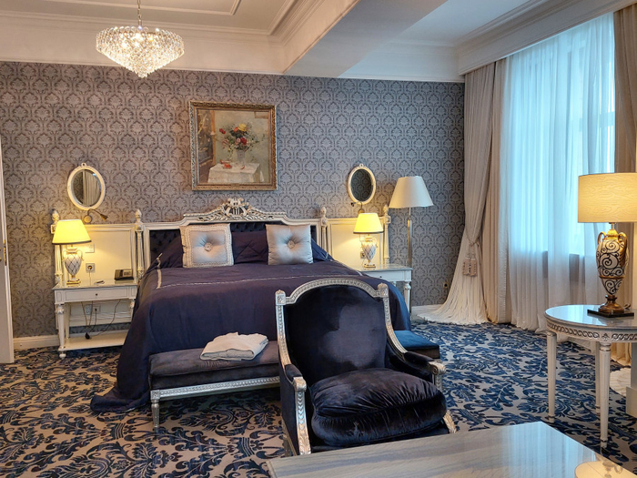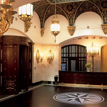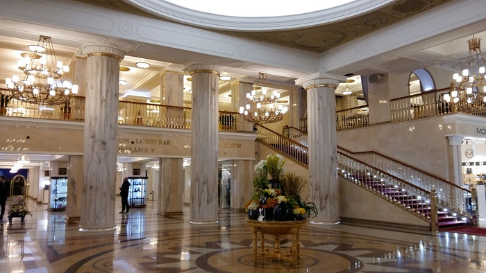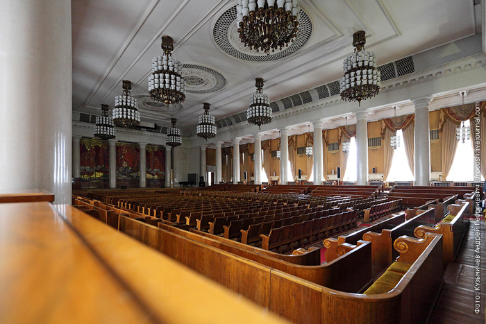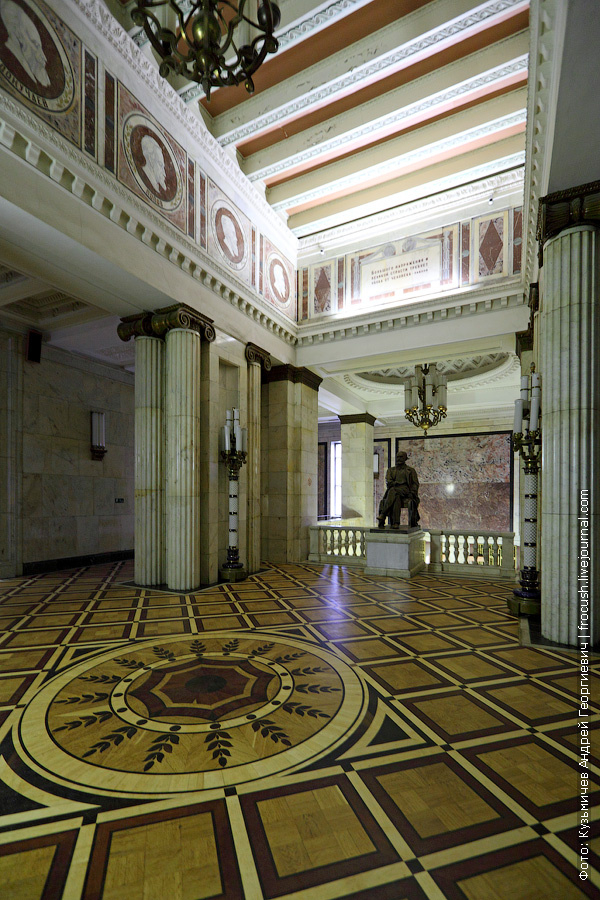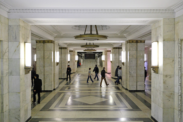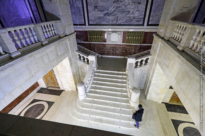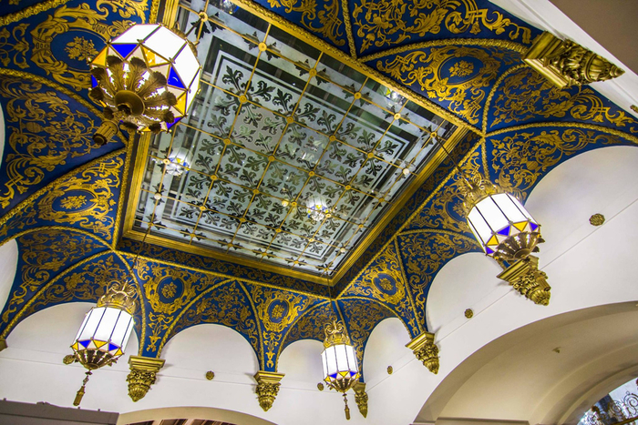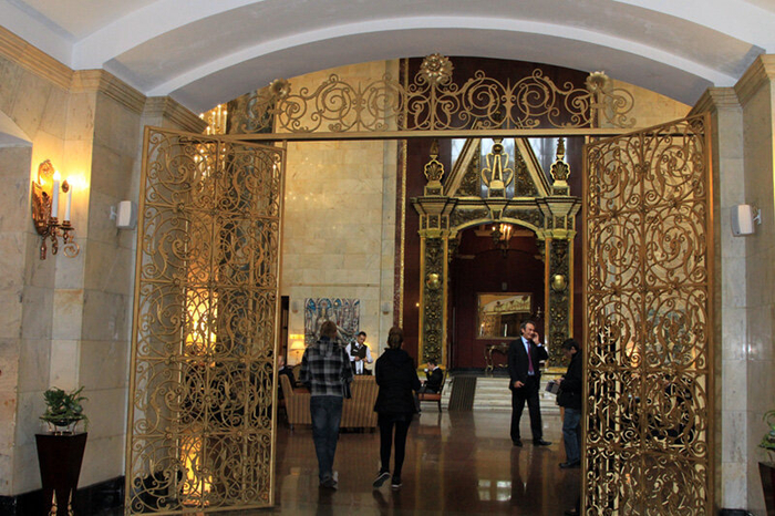 Оформление вестибюля напоминает не то царский терем, не то церковь, не то одну из палат Кремля: резное дерево, позолота, расписные потолки, причудливые карнизы и светильники. Лифтовый холл выполнен в форме алтарной ниши, а люстры на лестницах похожи на церковные паникадила.