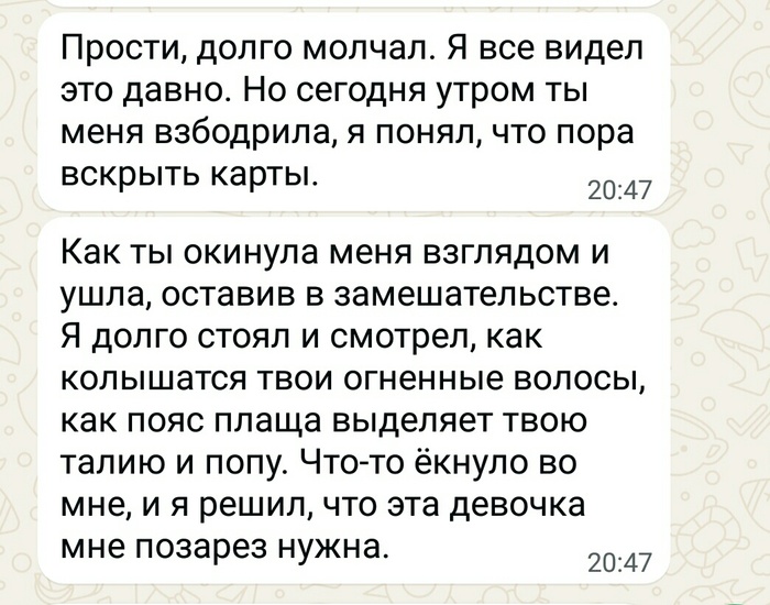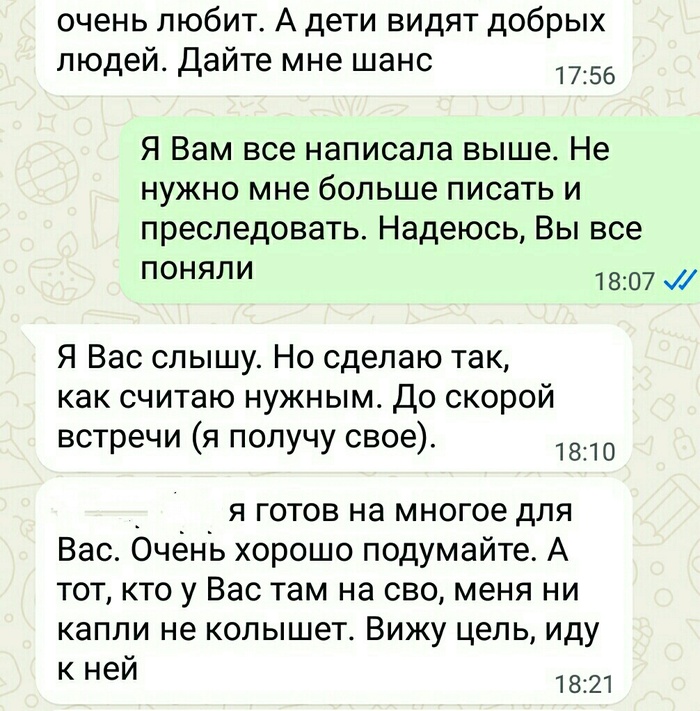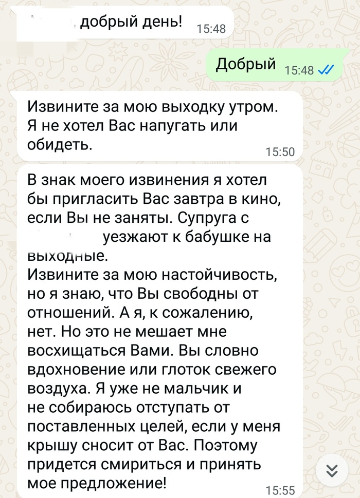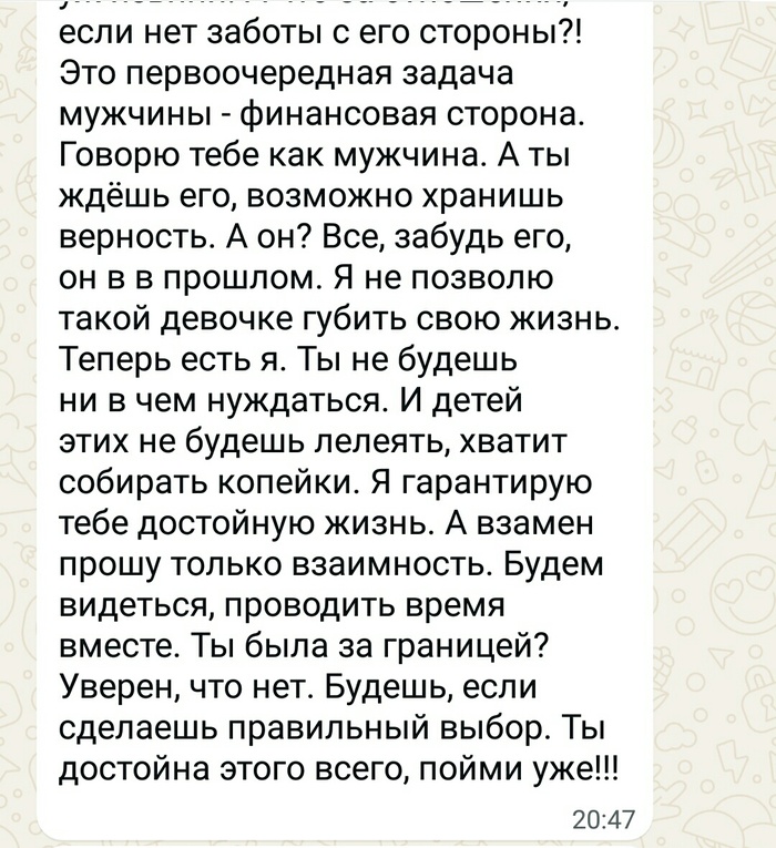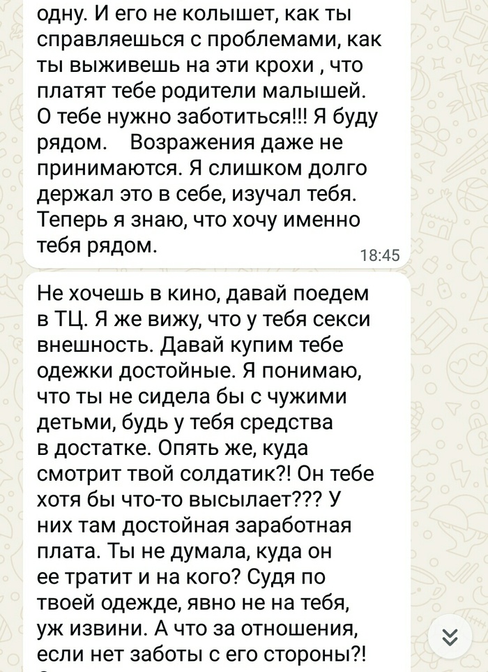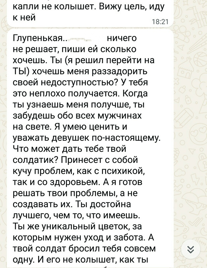 Второй пример. Вы сказали ему, что у вас парень, и что он на СВО. А для него, оказывается, это не аргумент. В его картине мира наличие парня никак не мешает начать новые отношения. Вон его не останавливает даже наличие жены и ребенка (детей?), парень, да еще и на СВО, это все равно что ничего. Плюс он сразу прикинул, что такой человек его не страшит. Кто его знает, кого он боится. Может, если бы парень работал в валютном контроле ЦБ РФ, этот мужик обмочился бы от ужаса и убежал за горизонт.