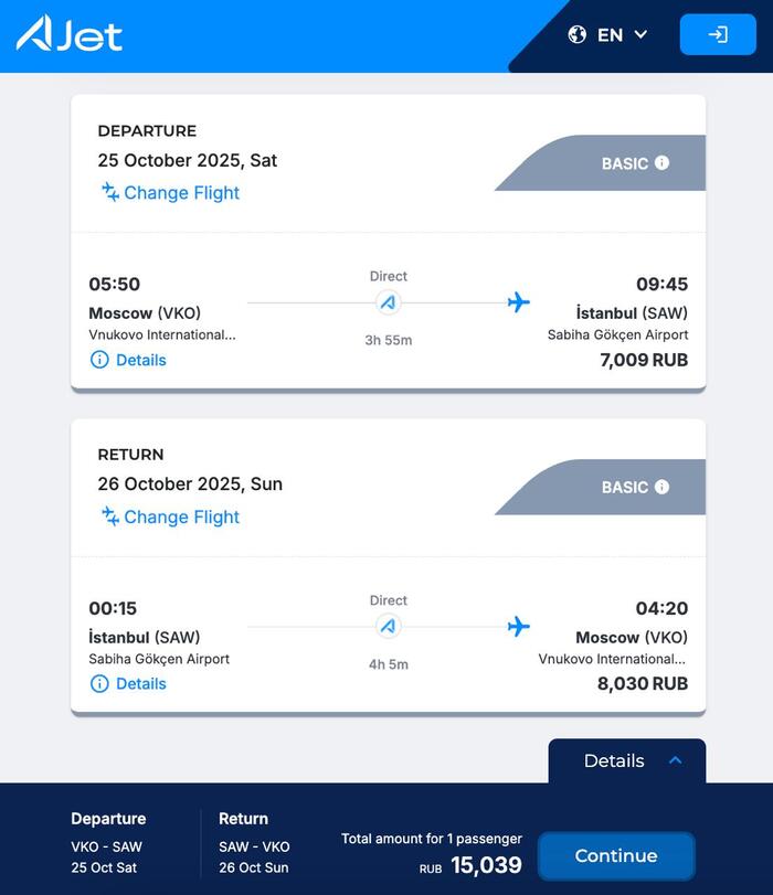 Обязательно проверьте рейсы по-отдельности. Например: Москва ⇄ Стамбул и Стамбул ⇄ Париж. Так может быть дешевле и больше вариантов.
