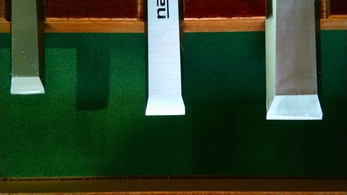 О качестве самого металла сейчас сказать ничего не могу, так как испытывать стамески без вышеперечисленных доработок не имеет никакого смысла. Единственное хочу отметить, что материал стамесок - хромомарганцевая сплав, а заявленная твёрдость - 59HRs. Так ли это, практика покажет.