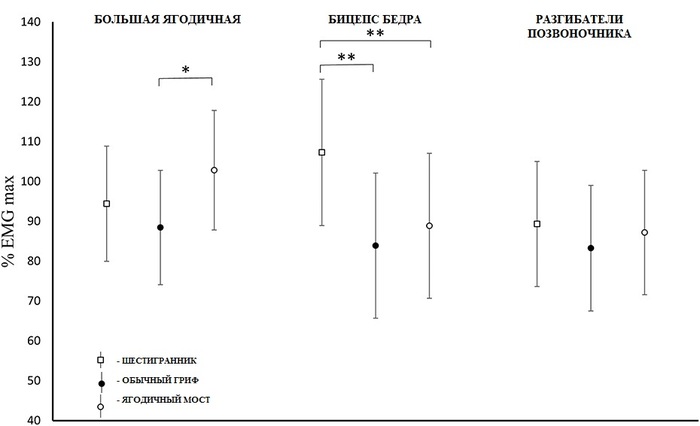 Короче говоря, бицепс бедра работал активнее при обычной тяге, чем при шестиграннике и «мостике». А вот большая ягодичная больше работала при «мостике», без существенной разницы между тягами с разными грифами. Разгибатели позвоночника вообще не показали значимой разницы при упражнениях. График ниже.