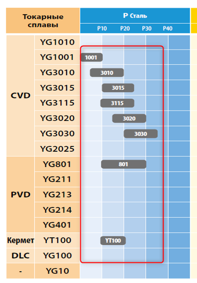 Цифры указывают на тип обработки: 10- самая финишная обработка, 40- самая тяжелая черновая. Соответственно если мы знаем, что у нас неровная заготовка, корка например на заготовке или еще каки-то нестабильные условия, то мы выбираем сплавы, которые находятся ближе к правой стороне столбика, то есть которые под P40.