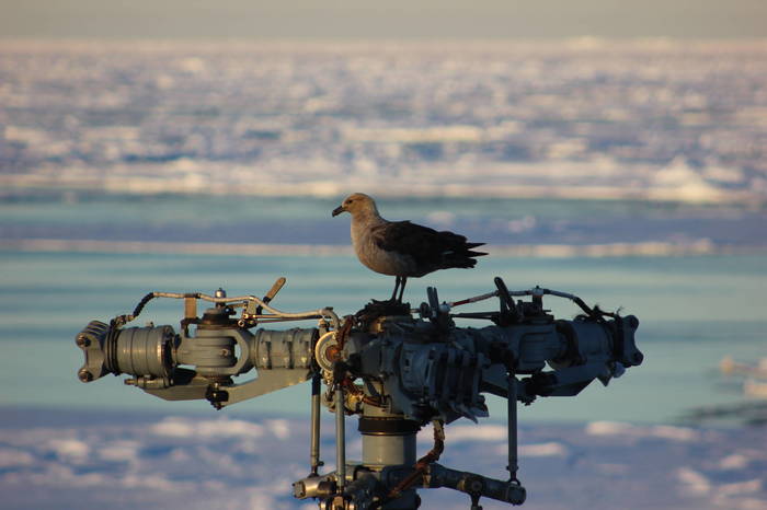 Грузили продукты из ямы на сани -- я работал в санях. Только начали ставить вторую клеть -- а на первой уже сидит поморник и курицу грызёт. Курица глубокой заморозки, поэтому грызть у поморника получается плохо, но он настойчивый. Отогнали, курицу спасли фанерой.