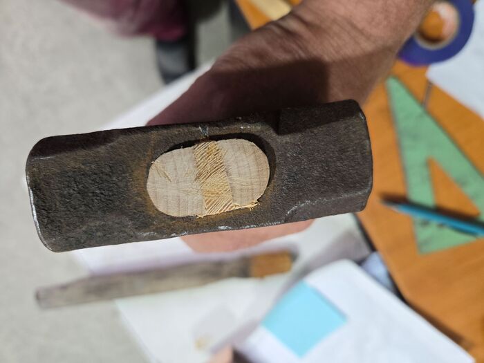 В оригинале, кстати, кувалдочка была насажена раззенкованной частью вниз на лиственичный брусок, в который сверху еще три гвоздя загнали - т.е. наскоряк напялили на то, что было под рукой. Ну, впрочем, работа у инструмента была непыльная, видать справлялся.
