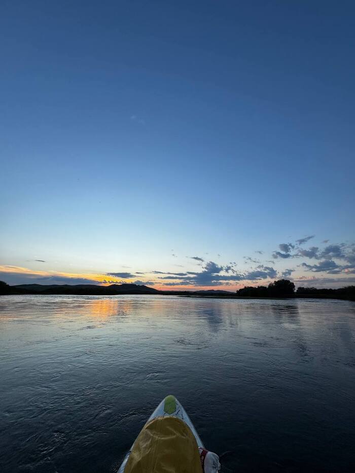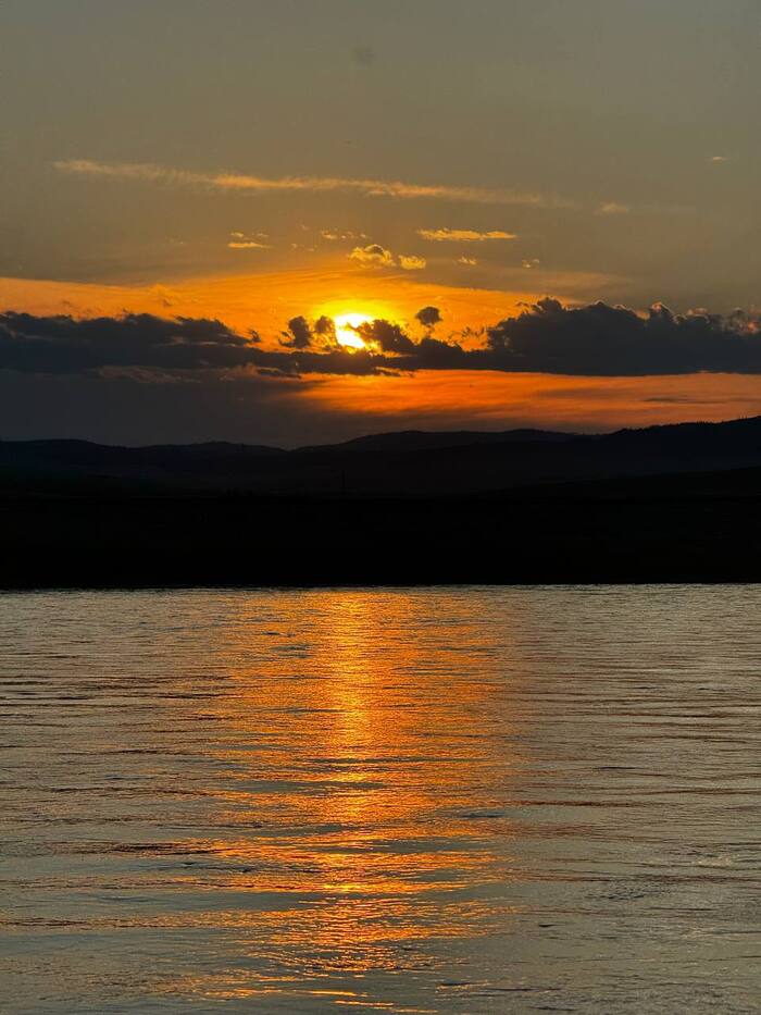 Неожиданно яркий солнечный диск стал растворяться на горизонте, словно кусочек сыра в масле растопает. Быстро забираем технику и выходим на воду в поисках стоянки для ночлега. Причалили чуть ниже села, Вика побежала с полевым душем в руках искать подходящее дерево, а я уплетаю плов. Храбрая и отважная ужинать отказалась, покуда уплела днем, под осуждающий взгляд местных коров, две банки говяжей тушенки.