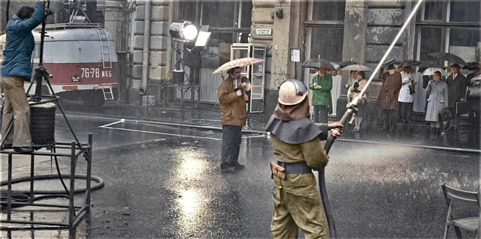 Интересные моменты на съемках культовых и популярных фильмов ХХ века. Подборка из 20 раскрашенных фотографий. Часть 6