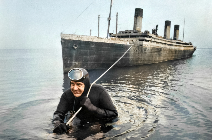 Профессиональный водолаз Кортни Браун буксирует 55-футовую масштабную модель затонувшего лайнера «Титаник» во время работы над фильмом «Поднимите Титаник!» (выпущенным в 1980 году).