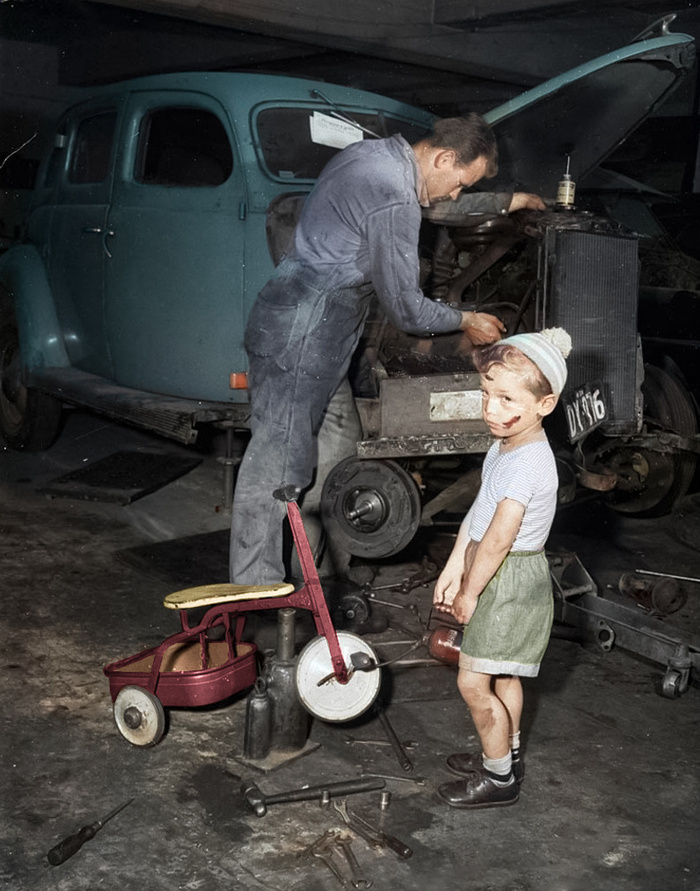 Мальчик с игрушечным набором в автомастерской чинит свой велосипед, пока его отец ремонтирует машину. Австралия, 1955 год
