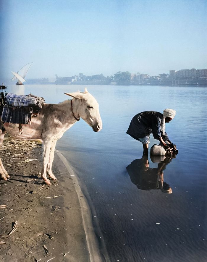 Египетский водонос наполняет кувшины в реке Нил, около 1910 года.