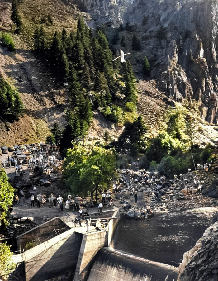 82-летний канатоходец Айви Болдуин пересекает плотину. Колорадо, 1948 год.