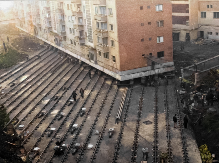 Перемещение 7600-тонного жилого дома для создания бульвара в Алба Юлия, Румыния, 1987 год.