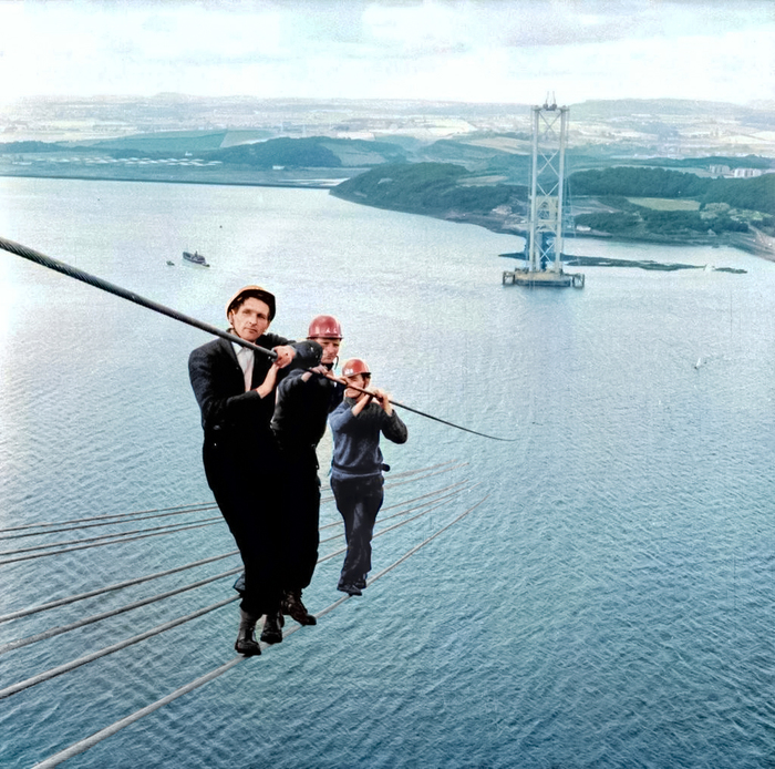 Рабочие на строительстве моста Форт-Роуд в Шотландии, 1961 год.