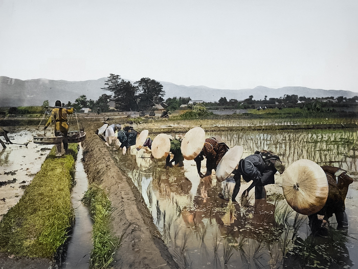 Японки в бамбуковых шляпах на рисовой плантации, 1895 год.