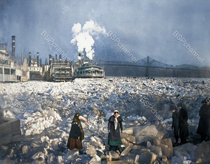 Мужчины, женщины и дети пробираются среди огромных ледяных глыб по замерзшей реке Огайо, Цинциннати, штат Огайо, зима 1917–1918 гг.