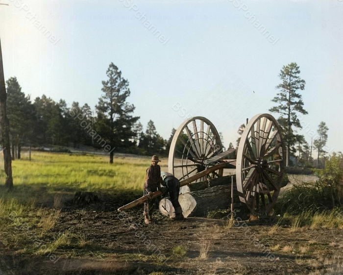 Погрузка бревен под большие колеса. Установка поднимает конец бревен, чтобы лошадям было легче тащить их к месту выгрузки. Национальный лес Коконино, США, 1910 год.