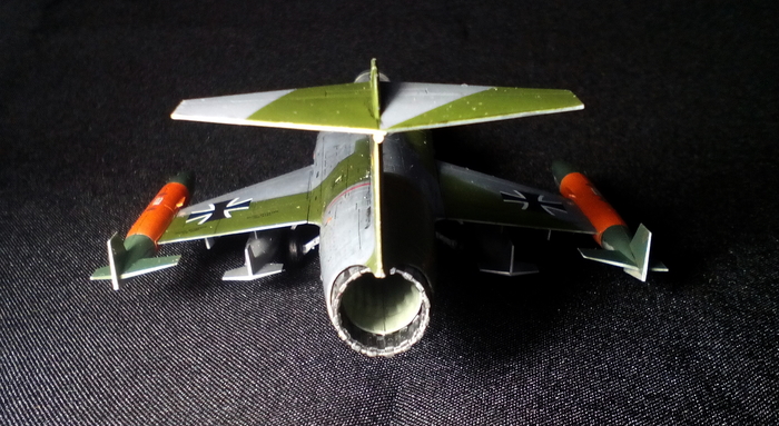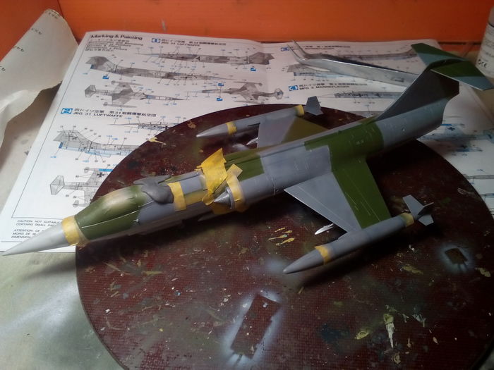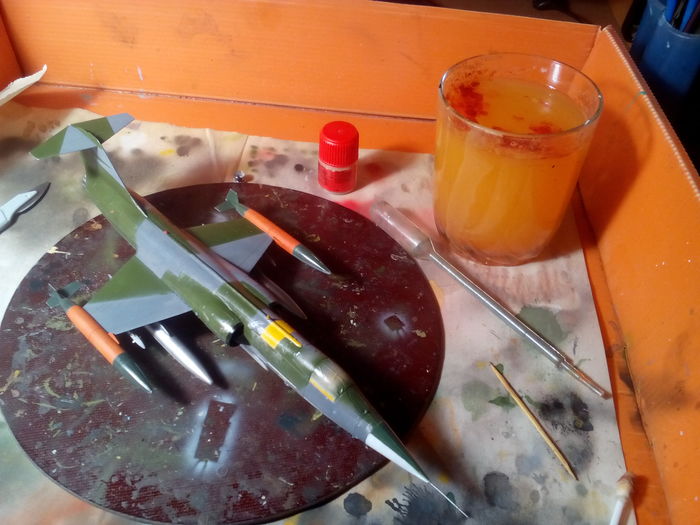 На грунт нанесён основной камуфляж из светло-серого и непонятно-зелёного (мешал на глаз) цветов. Геометрию создавал масками той же ленты. На основной камуфляж нанесён слой глянцевого лака и нанесены маски для окрашивания деталей других цветов - чёрных воздухозаборников, белого носа, оранжевых ПТБ и т.д.
