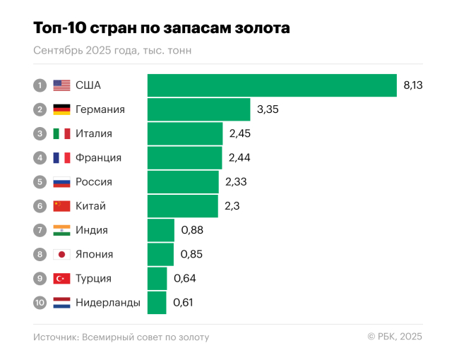 Но это фейк, который распространяют антироссийские ресурсы. На сегодняшний день Россия занимает пятое место в мире по объему золотых резервов, уступая лишь США, Германии, Италии и Франции. Хотя в начале 2010-х годов страна не входила даже в первую десятку крупнейших держателей золота.