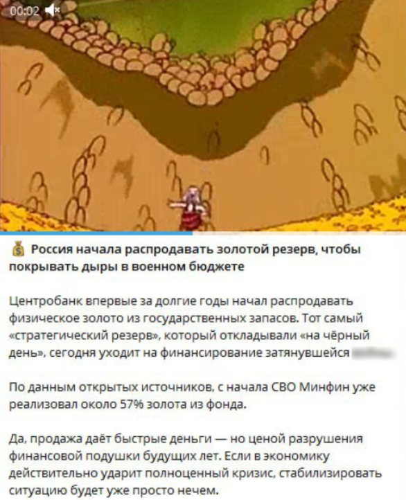В соцсетях пишут, что впервые за долгие годы Россия вынуждена распродавать золотой резерв, чтобы покрыть брешь в военном бюджете. Одновременно с этим указывается, что Минфин якобы реализовал уже более 57% золота из фонда.