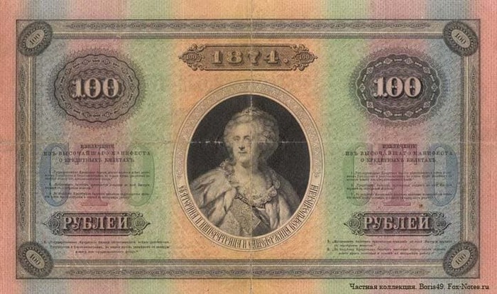 С 1866 года на купюрах стали изображать и портреты. Это значительно усложнило технологию производства и, как следствие, подделку банкнот. Например, «беленькую» сотню (хотя цвет к тому времени изменился, в народе ее продолжали называть по-прежнему) украсил портрет Екатерины Второй. Купцы дали ей прозвище «катенька», а воры — «бабка». По одной из версий, именно отсюда произошло жаргонное слово «бабки» применительно к деньгам.