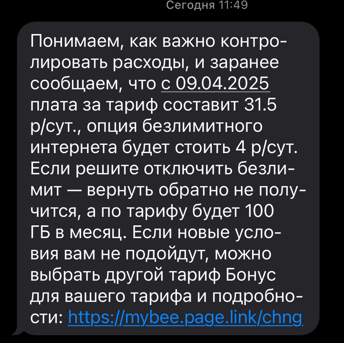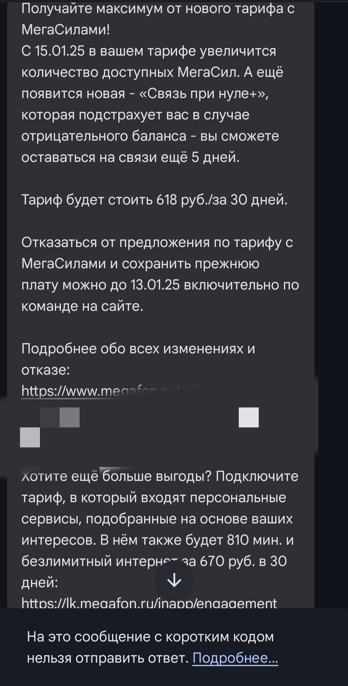 Не поняв откуда такое повышение, принялся читать историю СМС от мегафон. И нашёл такое сообщение от 24 декабря 2024г, о том что мой тариф изменится.