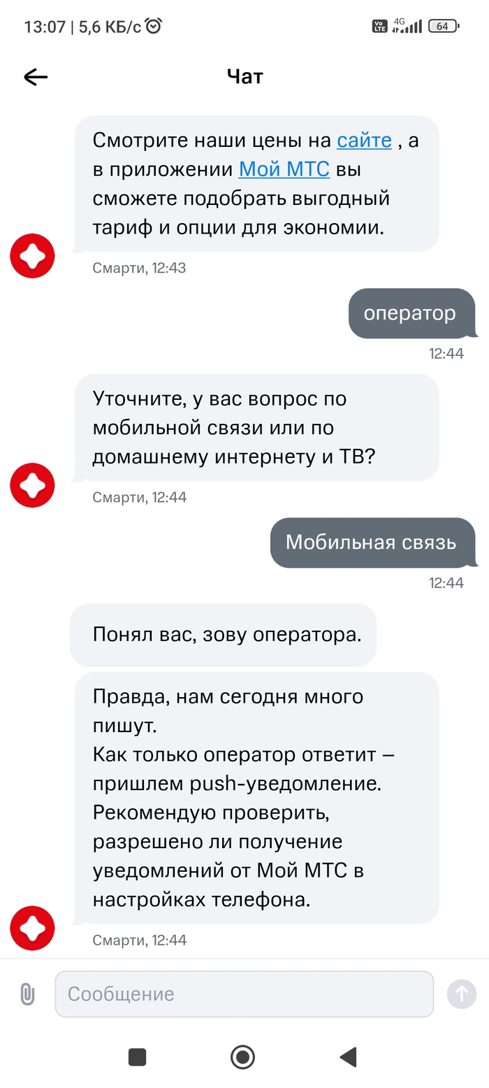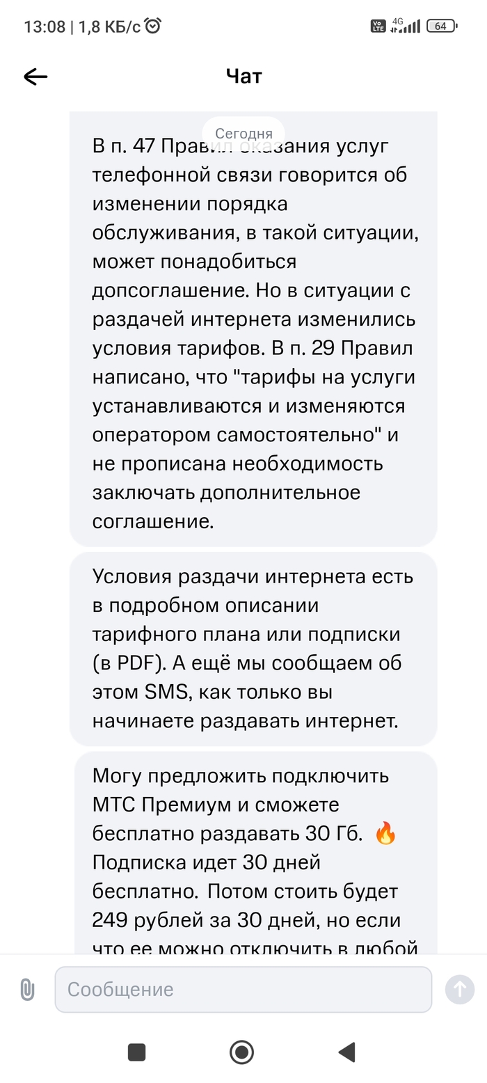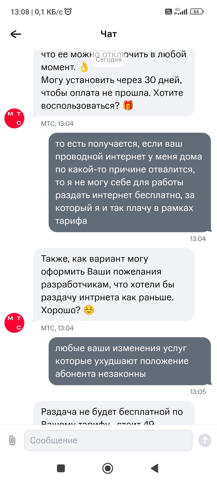 Короче, составили они там какую-то заявку на возврат тарифа, обещали за 4 дня рассмотреть. Прошла неделя, в чате мне по-прежнему пытаются объяснить, что я олень, тем временем списывая весомую посуточную плату (810 р не стал класть). Ну а теща обходит офисы других операторов, тихо матерится, смотря на цены и вспоминая деньки, пока я не пришел и все не испортил. Это я по их разговору с дочерью (женой) понял. Почему-то они теперь сами эти вопросы решают, без моего участия.