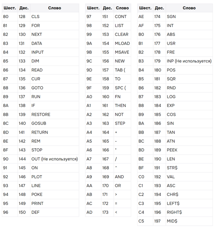 Коды ключевых слов языка Бейсик (Бейсик байткоды)