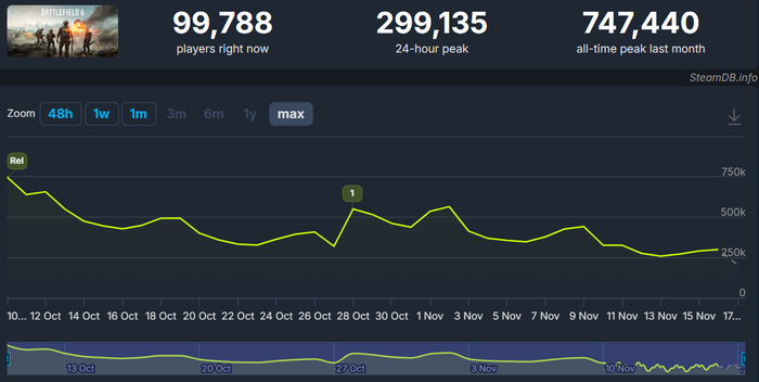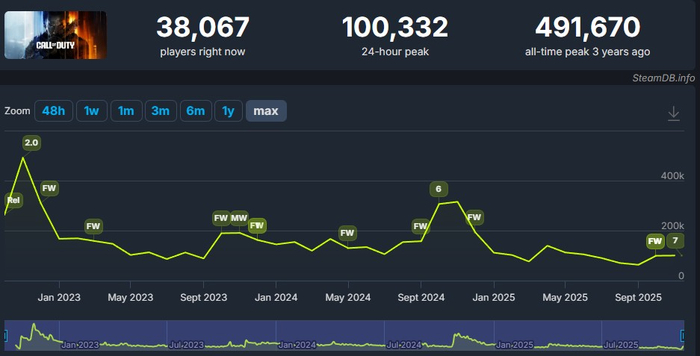 Battlefield 6 стартовал впечатляюще: более 747 тысяч игроков на релизе в Steam. Даже спустя месяц пик удерживает свыше 299 тысяч. Black Ops 7 на фоне этих цифр выглядит скромно — около 100 тысяч игроков на пике. Да, немалая часть аудитории могла уйти в Game Pass и консольные версии, но разрыв все равно оказался слишком большим, чтобы его игнорировать. Для сравнения, BO 6 собрала более 300 тысяч игроков в Steam на релизе.