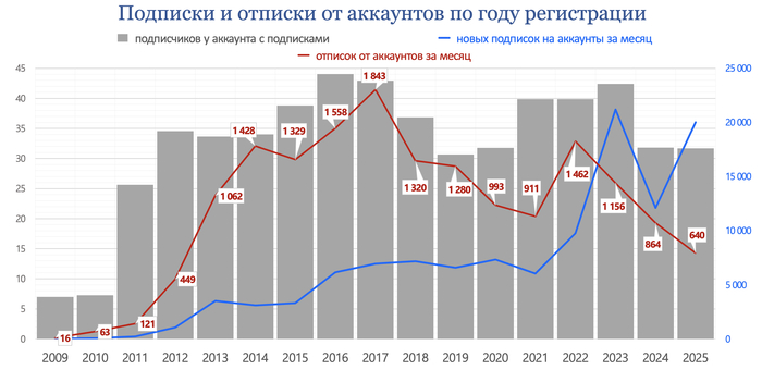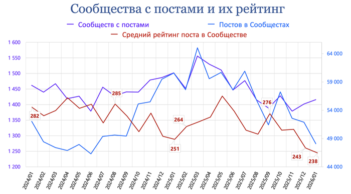 Пользователей, оформивших подписки на авторов или сообщества, на конец месяца было 1 757 978 (на 10 470 больше предыдущего). Суммарно число их подписок составило 21 064 067, из них 6 735 332 (32 %) на сообщества.