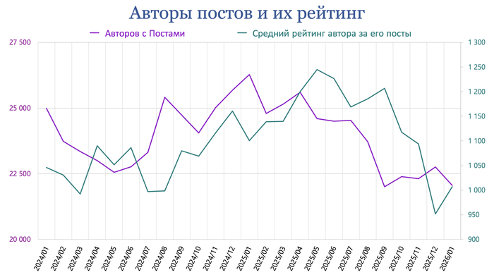 Из 93 889 постов, написанных в январе, имели рейтинг выше 10 000 - 74, от 5 000 до 10 000 - 468 (0,5%), от 1 000 до 5 000 - 4 396 (4,9%), от 100 до 1 000 - 16 221 (18,0%), от 0 до 100 - 56 346 (62,5%), с отрицательным - 12 627 (14,0%).