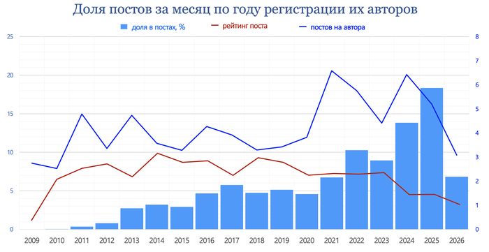 30 214 (33,5% постов, на 1,4% больше предыдущего месяца), написанных 36,4% от всех авторов с постами, попали в Горячее.