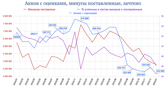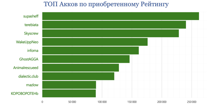 На конец месяца удалили свои аккаунты и не вернулись 1 727 пользователей (в прошлом месяце - 1 717). Восстановили аккаунты 356 (в прошлом месяце - 340). Переименовали свои акки 191 (в прошлом - 182).