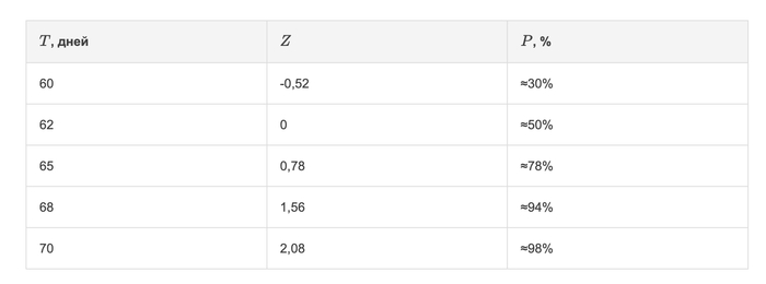 Далее используется нормальное приближение для оценки вероятности завершения проекта к определённому сроку. Вероятность вычисляем через функцию нормального стандартного распределения: