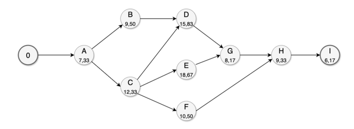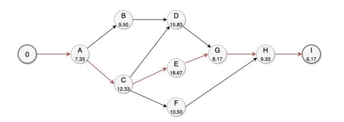 Критический путь: A - C - E - G - H - I. Ветвь через B - D не критична: даже завершив D, узел G ждёт более длинную работу E; ветвь C - F также короче G-ветви.
