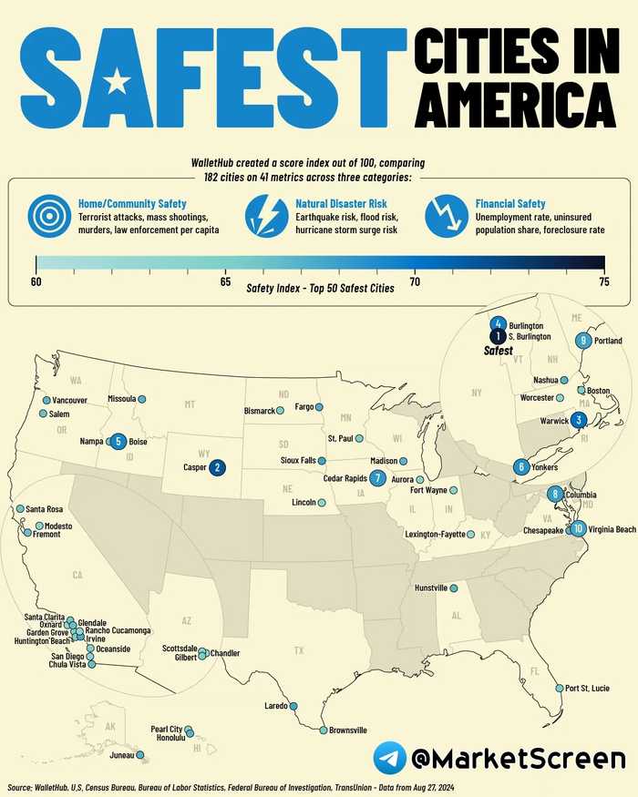 ▪️ Большая часть самых безопасных городов сосредоточена на северо-востоке США, в том числе Южный Берлингтон, Берлингтон-Сити, Портленд (штат Мэн), Нашуа, Уорик и Йонкерс. В этом регионе риск стихийных бедствий в целом ниже, чем в других регионах, что способствует повышению показателей безопасности.