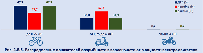 В большинстве (67,7%) ДТП участвующие СИМ имели электродвигатель мощностью до 0,25 кВт, на данные происшествия приходится 47,7% погибших и 67,8% раненых. С участием СИМ, имеющих электродвигатель мощностью от 0,25 кВт до 4 кВт, произошло почти каждое третье (32%) ДТП, на которые приходится более половины (52,3%) погибших и треть (31,9%) раненых. В 8 ДТП участвовали СИМ мощностью более 4 кВт, в которых 8 человек получили ранения (рис. 4.8.5).