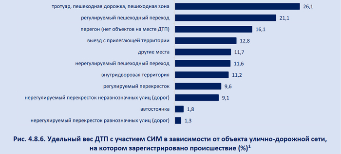 Из всех погибших в ДТП с участием СИМ 42 являлись лицами, передвигавшимися на СИМ, один погибший являлся пешеходом, на которого совершило наезд СИМ. Данный наезд совершен в населенном пункте при пересечении пешеходом проезжей части вне пешеходного перехода.