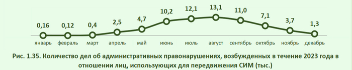 В 2023 году в отношении пользователей СИМ возбуждено более 66 тыс. дел об административных правонарушениях. Наибольшее количество нарушений выявлялось в летне-осенний период, что во многом обусловлено сезонной эксплуатацией СИМ (рис. 1.35).