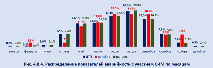Аварийность с участием СИМ носит сезонный характер. Наибольшие значения основных показателей аварийности характерны для теплого периода года. Рост аварийности начинается в апреле ввиду того, что с этого периода начинается активное использование СИМ. Наибольшая доля ДТП с участием СИМ зафиксирована в июле (17,5%), августе (20,6%) и сентябре (16%), наибольшее число погибших – также в указанные месяцы (по 18,6%) (рис. 4.8.4).