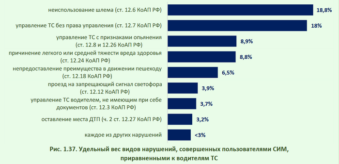 В 1,4% случаев нарушения, допущенные пользователями СИМ, квалифицированы по статьям Особенной части КоАП РФ, устанавливающим ответственность водителей механических ТС, поскольку технические характеристики некоторых СИМ соответствуют мопеду или мотоциклу.