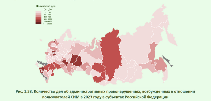 Наибольшее количество дел об административных правонарушениях, возбужденных в отношении пользователей СИМ, зарегистрировано в г. Москве (38,5 тыс.), Республике Татарстан (3,7 тыс.), г. Санкт-Петербурге (3,4 тыс.), Краснодарском крае (3,4 тыс.), Свердловской области (2,8 тыс.), Московской области (2,4 тыс.), Пермском крае (2,3 тыс.) и Кемеровской области (1,3 тыс.) (рис. 1.38).