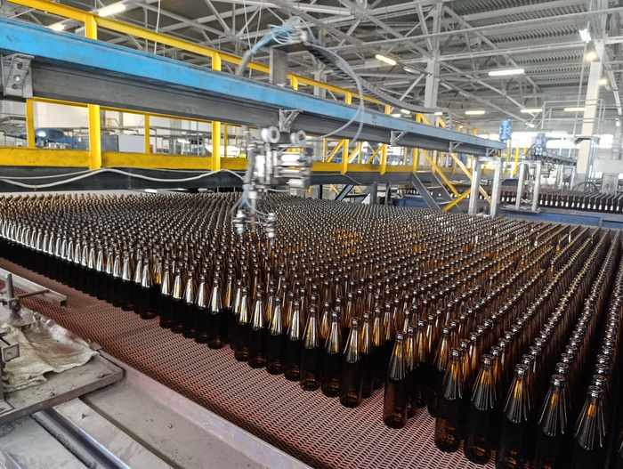 На предприятии работают две стекловаренные печи - одна печь для бесцветного стекла, другая для коричневого. На каждую печь приходится по 2 стеклоформующих машины. За одну минуту на заводе выпускается 700 бутылок.