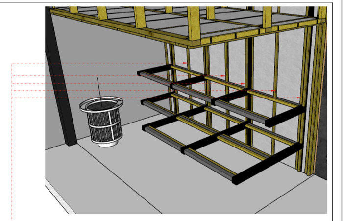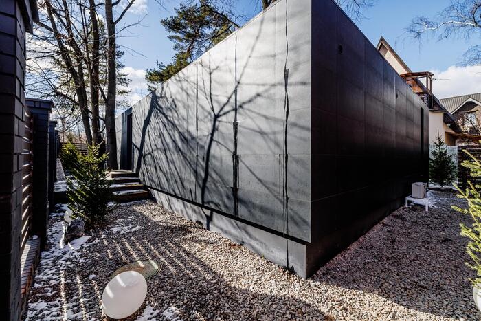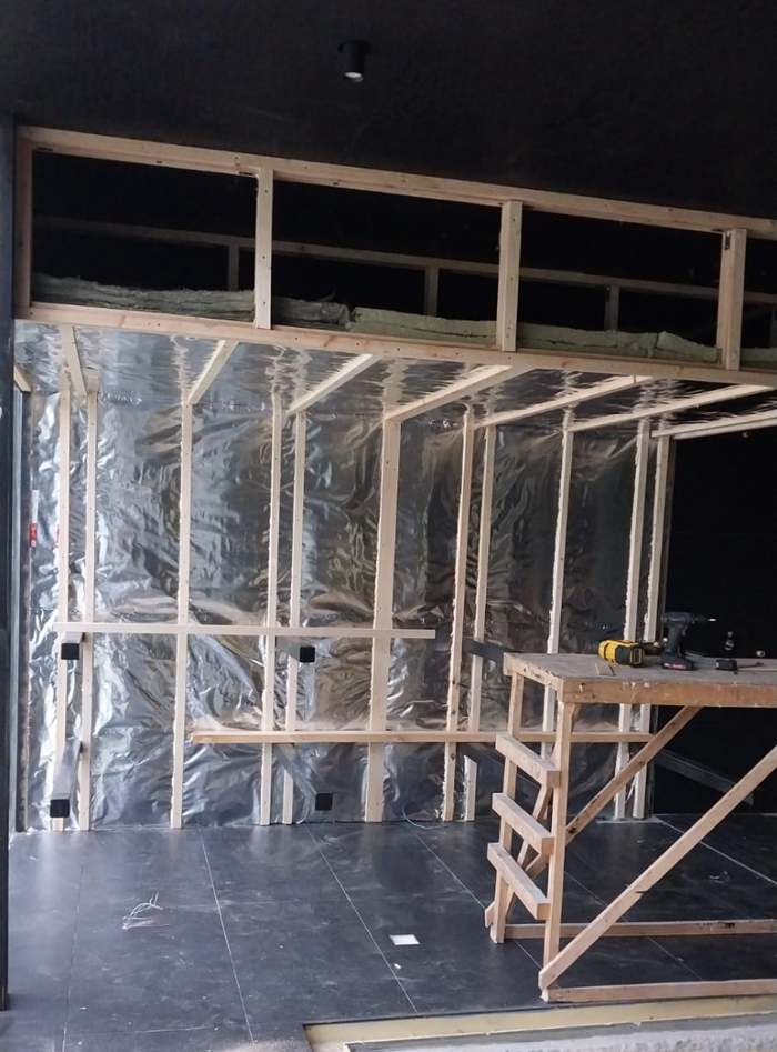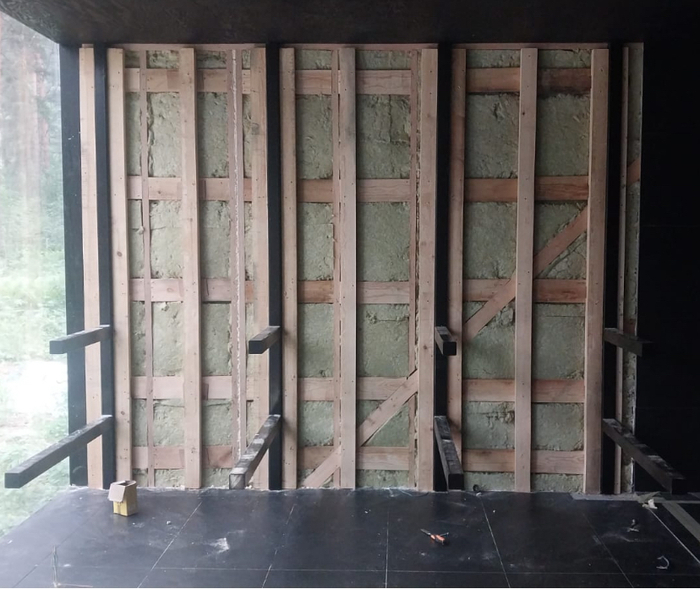 В итоге каркас и обрешетка увеличили толщину стены на 140 мм. Для того что бы не было видно через стекло с улицы всей конструкции, пришлось красить в черный цвет.