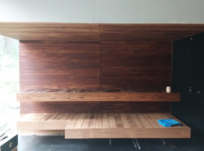 Так выглядит уже после отделки доской. Обшивали стены термоосиной. Полки сделаны из термососны. Торцы полков закрыли термососной нужна широкая и была только термосом на нужной ширины.