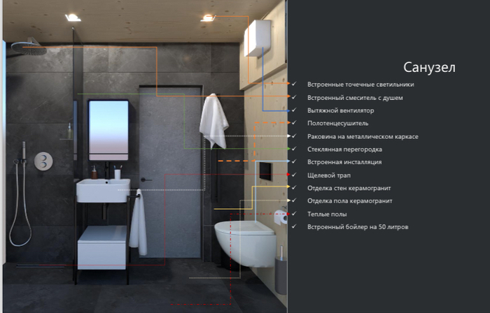 В стене интегрирован бойлер для горячей воды и вся инженерка.