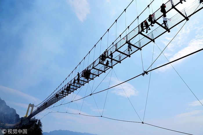 Полукилометровое сооружение буквально парит в воздухе над 300-метровым каньоном, и кажется таким хрупким. На самом же деле мост способен выдержать почти тысячу человек. А чтобы доказать его прочность, еще и устраивают испытания - да такие, что дух захватывает и мурашки по коже.