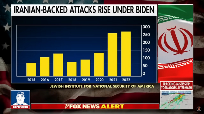 - Давайте пригласим Дэна Бонжино, он ведёт программу "Без фильтра с Дэном Бонжино", и также он автор новой книги "Одарённые поражением". Дэн? Доброе утро, Дэн. Этим утром наши гости говорили о том, что слабость провоцирует такие атаки. Конгрессмен Майк Уолтс вчера выложил в твиттере (прим.: запрещён на территории России) график - не знаю, видел ли ты его - он показывает уровень ракетных атак иранцев и связанных с ними войсками за последние несколько лет.